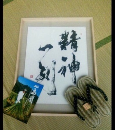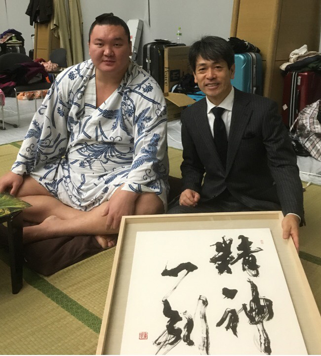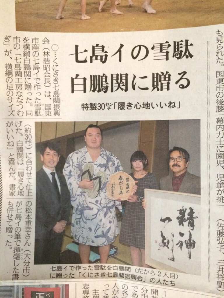 大相撲別府場所(大分県)の際、大分県国東市生産の七島イで作った筆で書いた書作品「精神一到」を 横綱白鵬関へ寄贈させて頂きました。